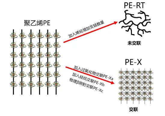 讲到PE-Xc管不得不讲一讲PE-X管,其实PE-Xc是属于PE-X管的一种,常见PE-X管分为三种 —— PE-Xa、PE-Xb、PE-Xc。PE-X到底是什么材料呢?下面通过一个图给大家解释一下: