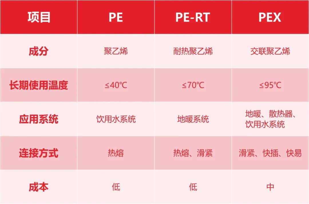 有关PE、PE-RT、PE-Xc材料性能总结如下图。